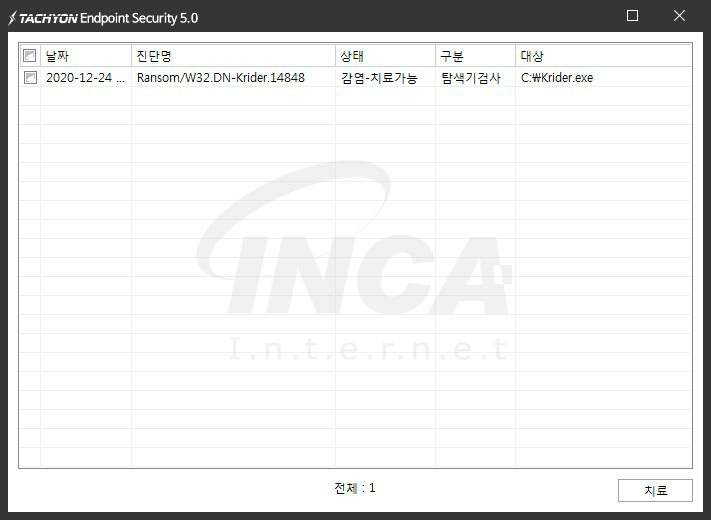 상기 악성코드는 잉카인터넷 안티바이러스 제품 TACHYON Internet Security 5.0에서 진단 및 치료가 가능하다.