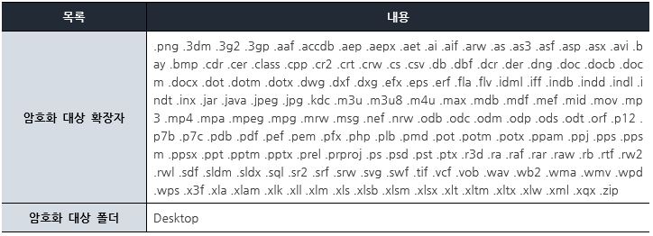 파일 암호화는 ‘%Desktop%’ 경로에서 [표 1]의 확장자에 해당하는 파일을 대상으로 진행된다.