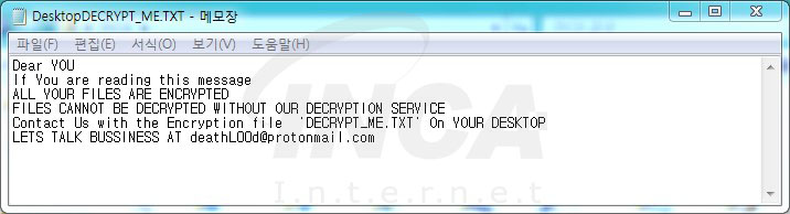 “Krider” 랜섬웨어에 감염되면 ‘%Desktop%’ 경로가 아닌 ‘C:\user\user-name’ 경로에 “DesktopDECRYPT_ME.TXT”란 이름의 랜섬노트를 생성하여 사용자에게 감염 사실과 복구 방법을 통보한다.