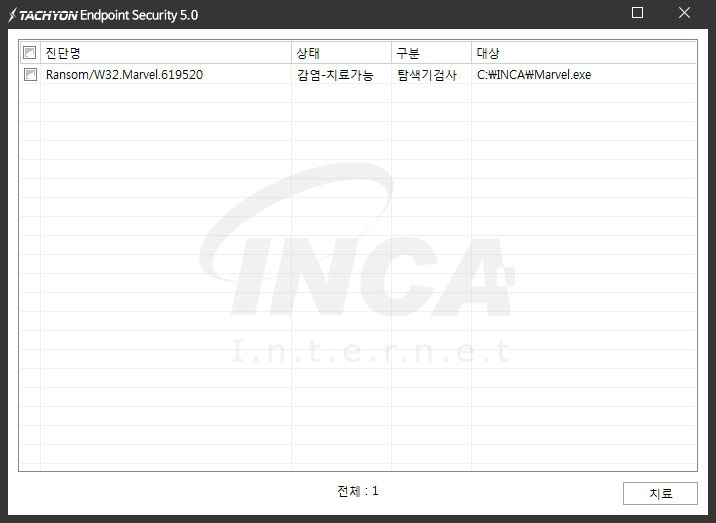 상기 악성코드는 잉카인터넷 안티바이러스 제품 TACHYON Endpoint Security 5.0에서 진단 및 치료가 가능하다.