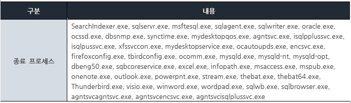 “Marvel” 랜섬웨어 실행 시 현재 실행중인 프로세스 목록을 확인하여 [ 1] 목록의 프로세스를 종료시킨다.