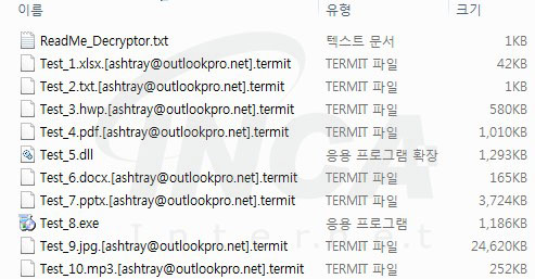파일을 검색하여 [ 2] 암호화 대상 조건에 부합하는 파일을 암호화한 뒤, “[Ashtray@outlookpro.net].termit” 확장자를 암호화한 파일에 덧붙인다.