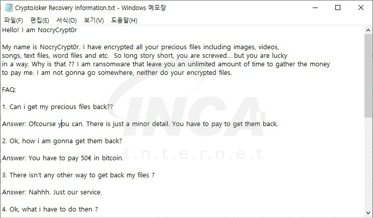 ‘%USERPROFILE’ 경로를 대상으로 파일을 암호화하며 확장자에 따라 파일 감염 방식과 변경하는 확장자가 다른 “NocryCryptor” 랜섬웨어가 발견되었다. 만약, 암호화 대상 파일의 확장자가 “.txt” 또는 “.md”인 경우 파일 전체가 암호화되고 “.fully.nocry”라는 확장자가 파일명에 추가된다. 그 외의 확장자는 파일의 일부만 암호화를 하며 “partially.nocry”라는 확장자를 파일명에 추가한다. 암호화가 완료되면 바탕화면에 “CryptoJoker Recovery Information.txt” 파일을 생성하여 감염 사실을 알린다.