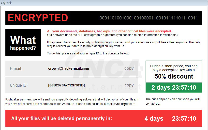 12월 초, CryLock 랜섬웨어가 발견되었다. 해당 랜섬웨어는 ‘%TEMP%’ 경로에 자가복제한 후, 파일을 암호화한다. 암호화된 파일은 “[공격자의 Email].[랜덤 문자열]” 형태의 확장자가 붙으며, 암호화 대상 경로마다 랜섬노트를 생성한다. 해당 과정이 완료되면 복구와 관련된 정보를 삭제 또는 비활성화하여 시스템 복구를 무력화한다. 또한, 시스템 재부팅 시 자동 실행되도록 설정하여 [그림 4]의 랜섬노트를 띄우고 랜섬머니를 지급할 것을 유도한다.