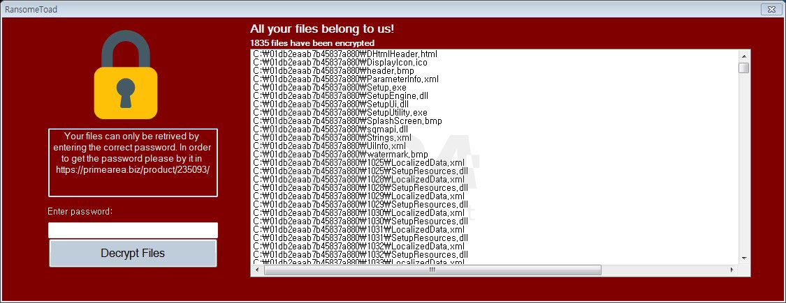 “RansomToad” 랜섬웨어는 [그림 7]의 랜섬노트를 띄워 감염 사실을 알린다. [그림 7] 우측에 보이는 암호화된 파일 로그는 'C:\Users\User-Name\AppData\Local'에 "RansomeToad.txt"란 이름의 파일로 저장된다.