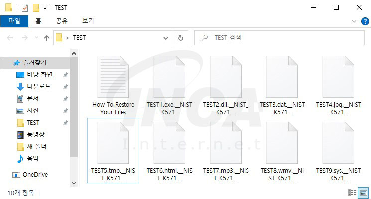 해당 랜섬웨어에 감염되면 %USERPROFILE% 경로 및 하위 폴더의 모든 확장자의 파일이 암호화 되며 암호화된 파일명의 확장자 뒤에 “.__NIST_K571__” 라는 이름의 확장자를 덧붙인다.