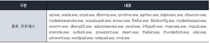 그리고 암호화하기 이전에 더 많은 파일을 효율적으로 암호화하기 위해 [표 2]에 해당하는 특정 프로세스 종료한다.