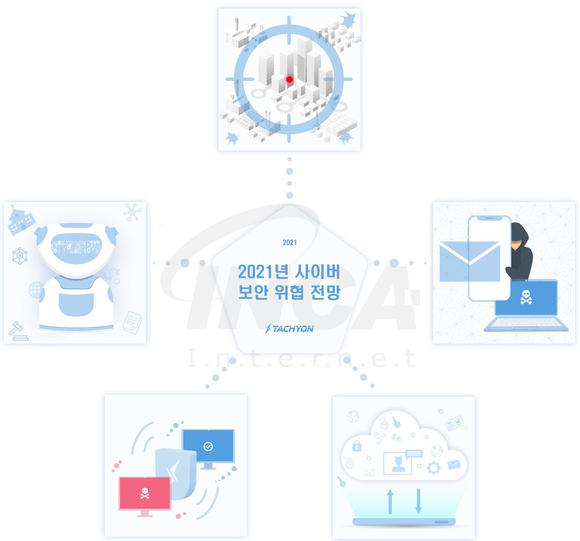 2020년은 코로나 바이러스가 대유행을 하며 재택근무, 원격근무 등 비대면, 온라인 업무가 폭발적으로 증가했다. 2021년은 이러한 비대면 환경을 노리는 사이버 공격이 지속적으로 발생할 것으로 예상되며 그 중 5가지 위협요소를 선정했다.
