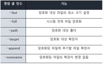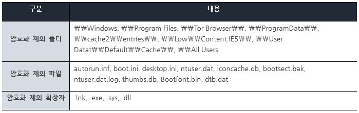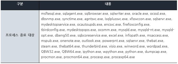 파일 암호화 이외에도 SQL 및 database 문자열이 포함된 서비스와 아래 [표 2]에 해당하는 프로세스를 종료하며 명령줄 인수를 사용해 암호화 대상을 변경할 수 있는 기능이 존재한다.
