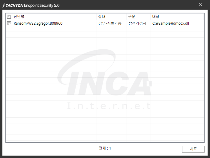 상기 악성코드는 잉카인터넷 안티바이러스 제품 TACHYON Endpoint Security 5.0에서 진단 및 치료가 가능하다.