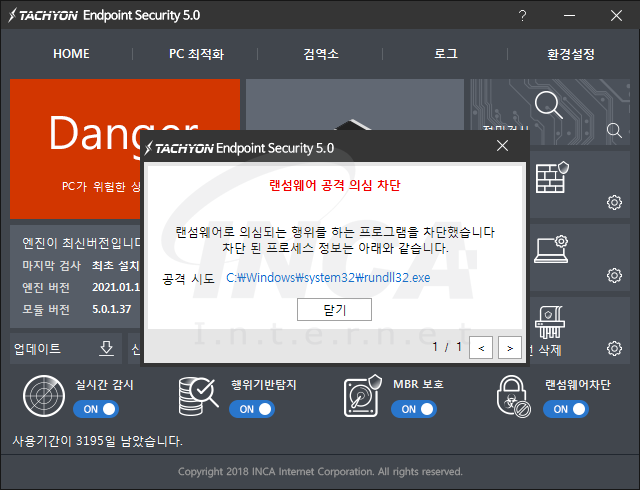 그리고 TACHYON Endpoint Security 5.0 제품의 랜섬웨어 차단 기능을 이용하면 사전에 파일 암호화 행위를 차단할 수 있다.