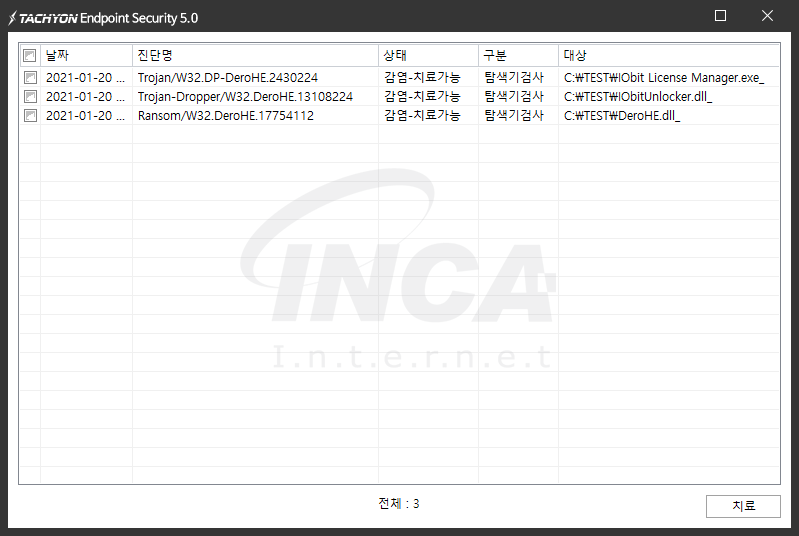 상기 악성코드는 잉카인터넷 안티바이러스 제품 TACHYON Internet Security 5.0에서 진단 및 치료가 가능하다.