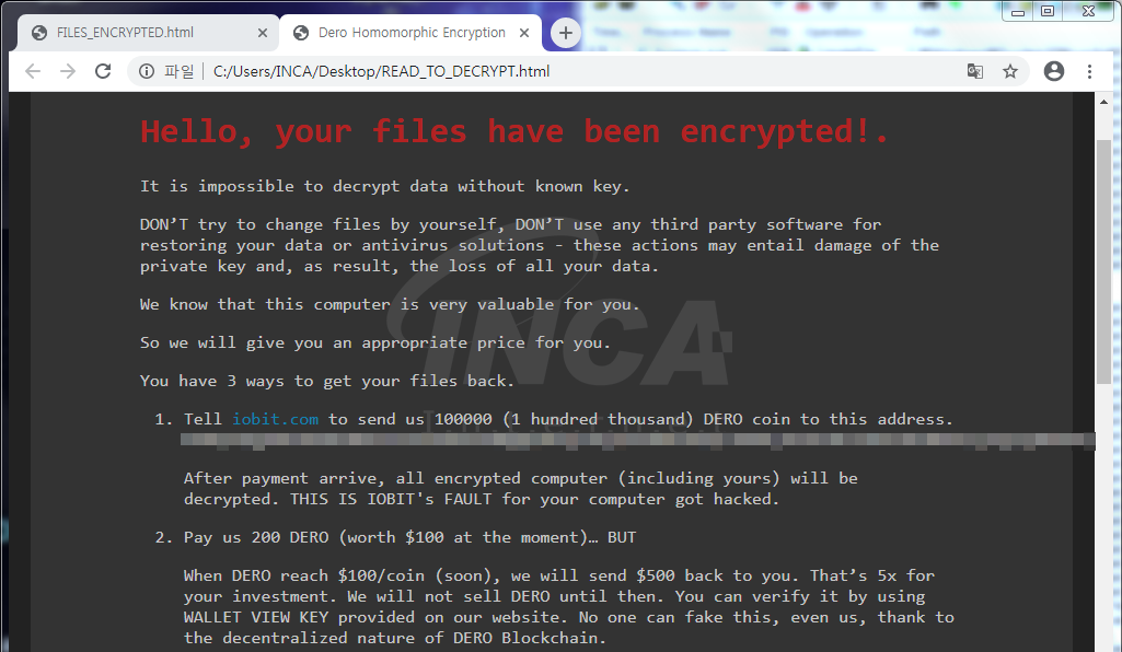 “DeroHE”에 감염되면 바탕화면에 “READ_TO_DECRYPT.html”란 이름의 랜섬노트를 생성하여 사용자에게 감염사실을 알리고 파일 복구 비용인 200 Dero 코인을 지불할 것을 요구한다. 추가로 동일 경로에 생성되는 “FILES_ENCRYPTED.html” 파일에는 감염된 파일의 경로가 작성되어 있다.