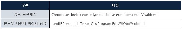 해당 랜섬웨어는 원활한 감염을 위해 [표 1]의 목록에 해당하는 브라우저가 실행 중인 경우 강제로 종료하고, WMI를 이용하여 윈도우 디펜더(Windows Defender)에서 랜섬웨어의 실행과 관련된 값들은 검사하지 않도록 설정하여 “DeroHE” 랜섬웨어가 정상적으로 실행되게 한다.
