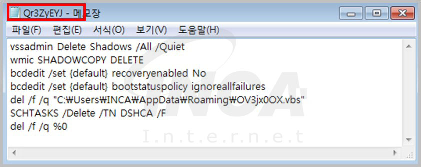 그리고 실행된 배치파일은 볼륨 섀도우 복사본을 모두 삭제하고, 윈도우 복구 모드 비활성화, 윈도우 오류 복구 알림 비활성화 설정을 한다. 또한 해당 배치파일을 실행하였던 vbs 파일을 삭제하여 흔적을 지운다.
