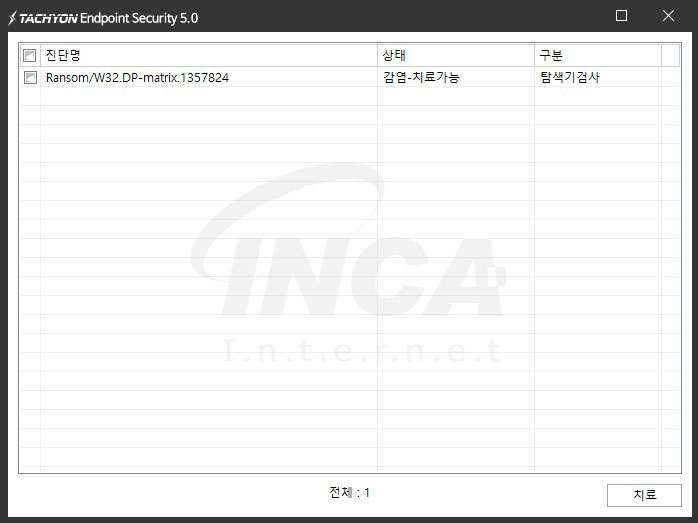 상기 악성코드는 잉카인터넷 안티바이러스 제품 TACHYON Internet Security 5.0에서 진단 및 치료가 가능하다.