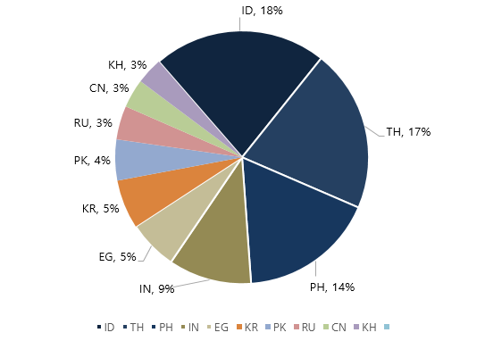 2020년 4분기(10월 1일 ~ 12월 31일) 동안 탐지된 랜섬웨어를 국가별로 비교하였을 때 인도네시아(ID)가 18%로 가장 높은 비중을 차지하였고, 태국(TH)과 필리핀(PH)이 각각 17%와 14%, 인도(IN)와 이집트(EG)가 각각 9%와 5%씩으로 그 뒤를 따랐다.