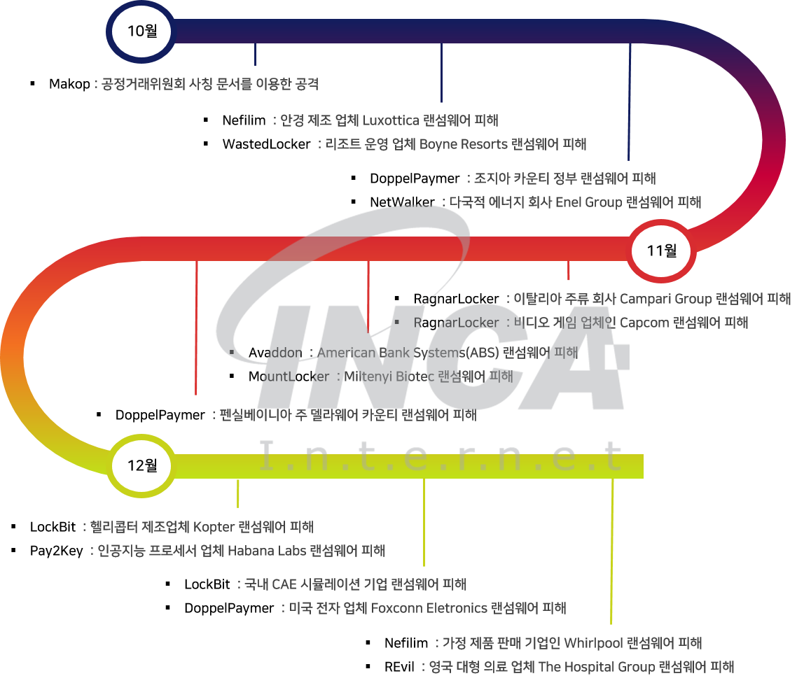 2020년 4분기(10월 1일 ~ 12월 31일) 동안 랜섬웨어 동향을 조사한 결과, 국내/외에서 “에그레고르(Egregor)”, “류크(Ryuk)”, “클롭(Clop)” 등의 랜섬웨어로 인한 피해가 다수 발견되었다. 10월에는 공정거래위원회 사칭 문서를 이용한 “마콥(Makop)” 랜섬웨어 공격이 있었고, 11월과 12월에는 이탈리아 주류 회사 Campari Group과 영국 대형 의료 업체 The Hospital Group이 각각 “라그나락커(RagnarLocker)”와 “레빌(REvil)” 랜섬웨어 공격을 받아 피해가 발생했다.