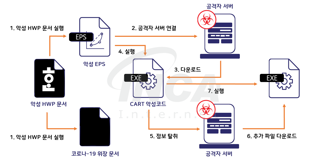 2020년 “인천광역시 코로나바이러스 대응 긴급 조회”라는 제목의 악성 한글 문서가 발견되었다. 해당 한글 문서는 코로나 19 바이러스와 관련된 내용으로 공공기관을 사칭하여 유포되었는데, 사용자가 정상 문서처럼 위장한 내용에 속아 악성 한글 문서를 실행한다면 문서에 삽입된 EPS(Encapsulated PostScript)를 통해 “CRAT” 악성코드를 다운로드하고 사용자의 정보를 탈취한다.