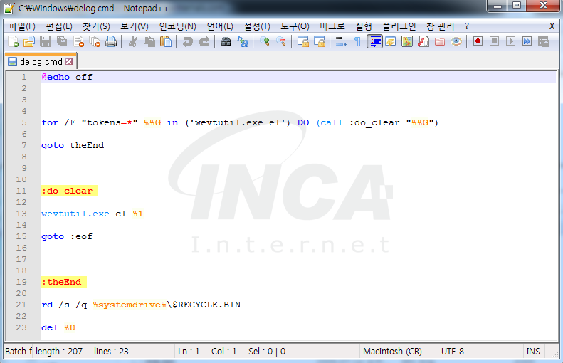 파일 암호화 이외에도 명령 프롬프트에서 모든 이벤트 뷰어 로그 지우기 위해 ‘Windows’ 폴더에 ”delog.cmd" 파일을 생성하고 실행한다.