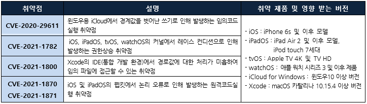 Apple사에서 자사 제품의 보안 업데이트를 발표하고, 관련 취약점을 해결하기 위해 최신 버전으로 업데이트할 것을 권고하였다.