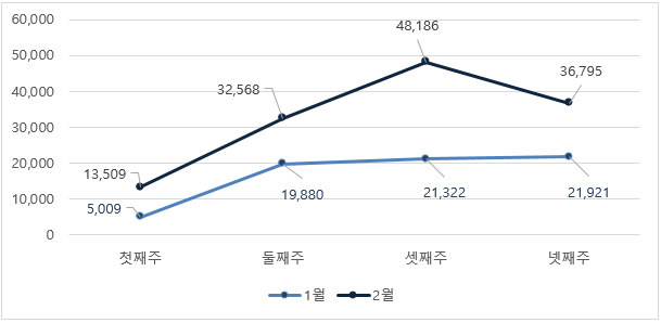 2월 한달 동안 악성코드 진단 현황을 주 단위로 살펴보았을 때 1월에 비해 증가한 추이를 보이고 있다.
