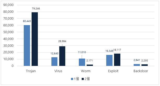 2월에는 악성코드 유형별로 1월과 비교하였을 때 Trojan, Virus 및 Exploit의 진단 수가 증가하였고, Worm과 Backdoor의 진단 수가 감소하였다.