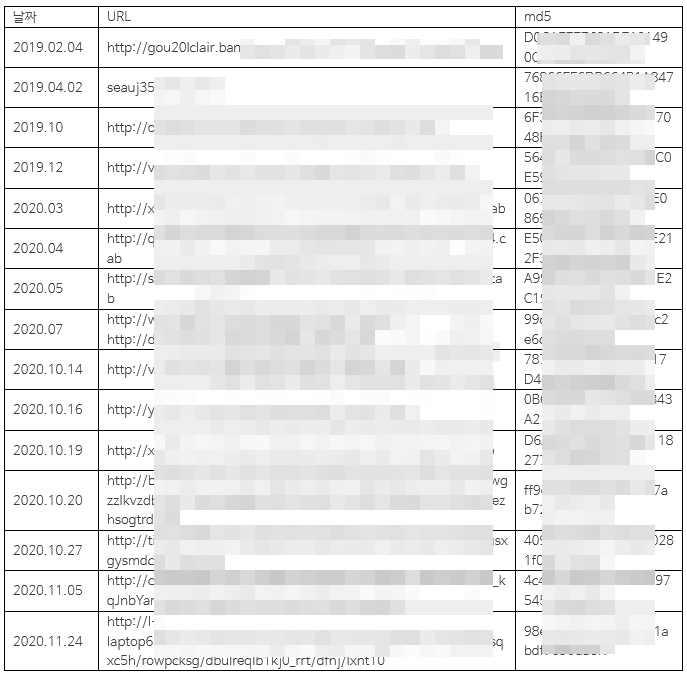 2019년 초반부터 2020년 중반까지는 “http://[영어,숫자 조합].com/[영어,숫자 조합]/[영어,숫자 조합].php? l=[영어,숫자 조합].cab” 의 구조에 C&C서버에 연결하였다. 하지만 2020년 말부터는 다음과 같이 “http://[영어, 숫자 조합].com/[update 또는 share]/[랜덤 문자열]/[랜덤 문자열]/[영어,숫자 조합]” 이전과 다른 구조의 도메인을 사용하였다.
