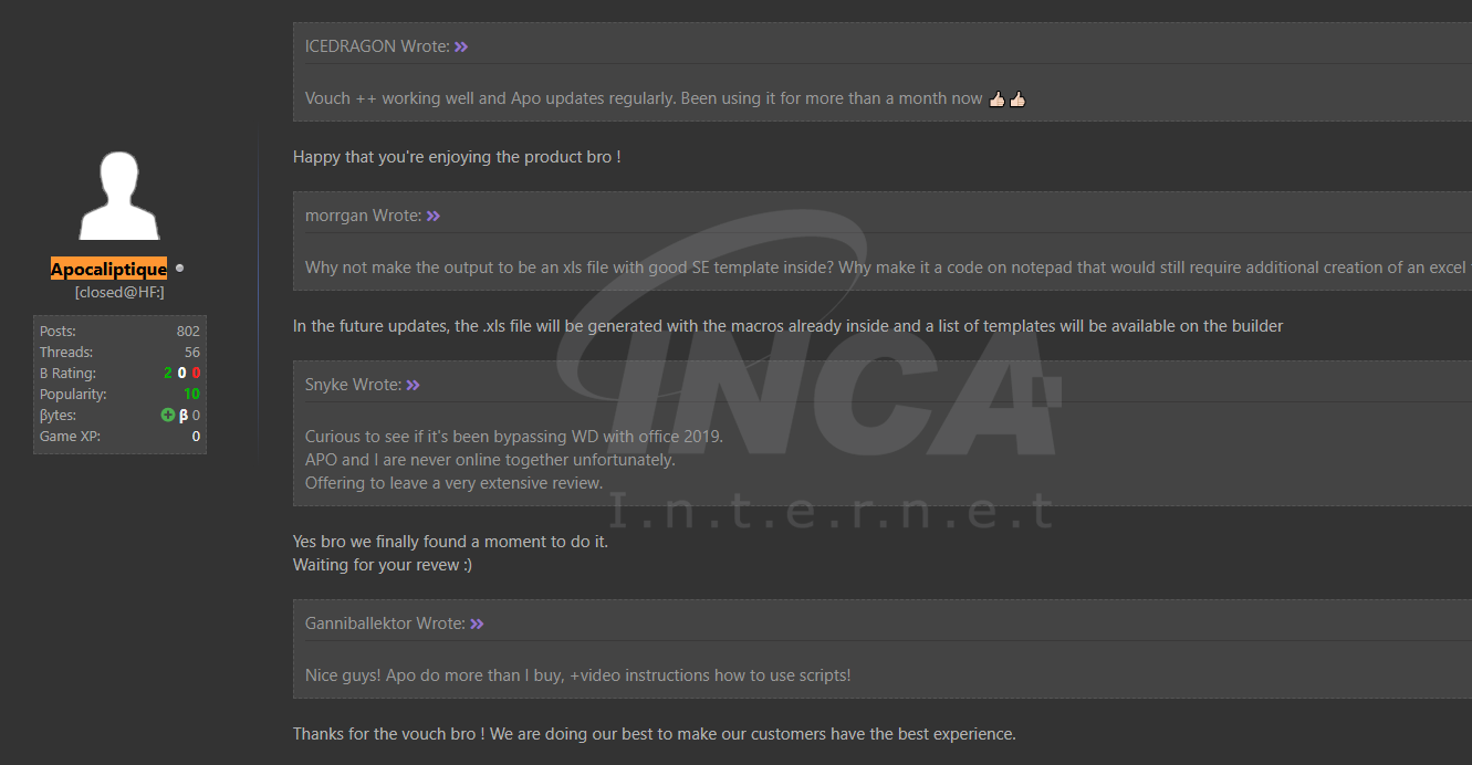 과거부터 “APOMacroSploit” 악성코드 제작자들은 커뮤니티에 광고를 하며 판매하고 있었다. 해당 빌더를 이용하여 만든 악성 매크로 문서 파일이 백신 프로그램(AV)과 Windows Defender를 우회 할 수 있다고 홍보한다.