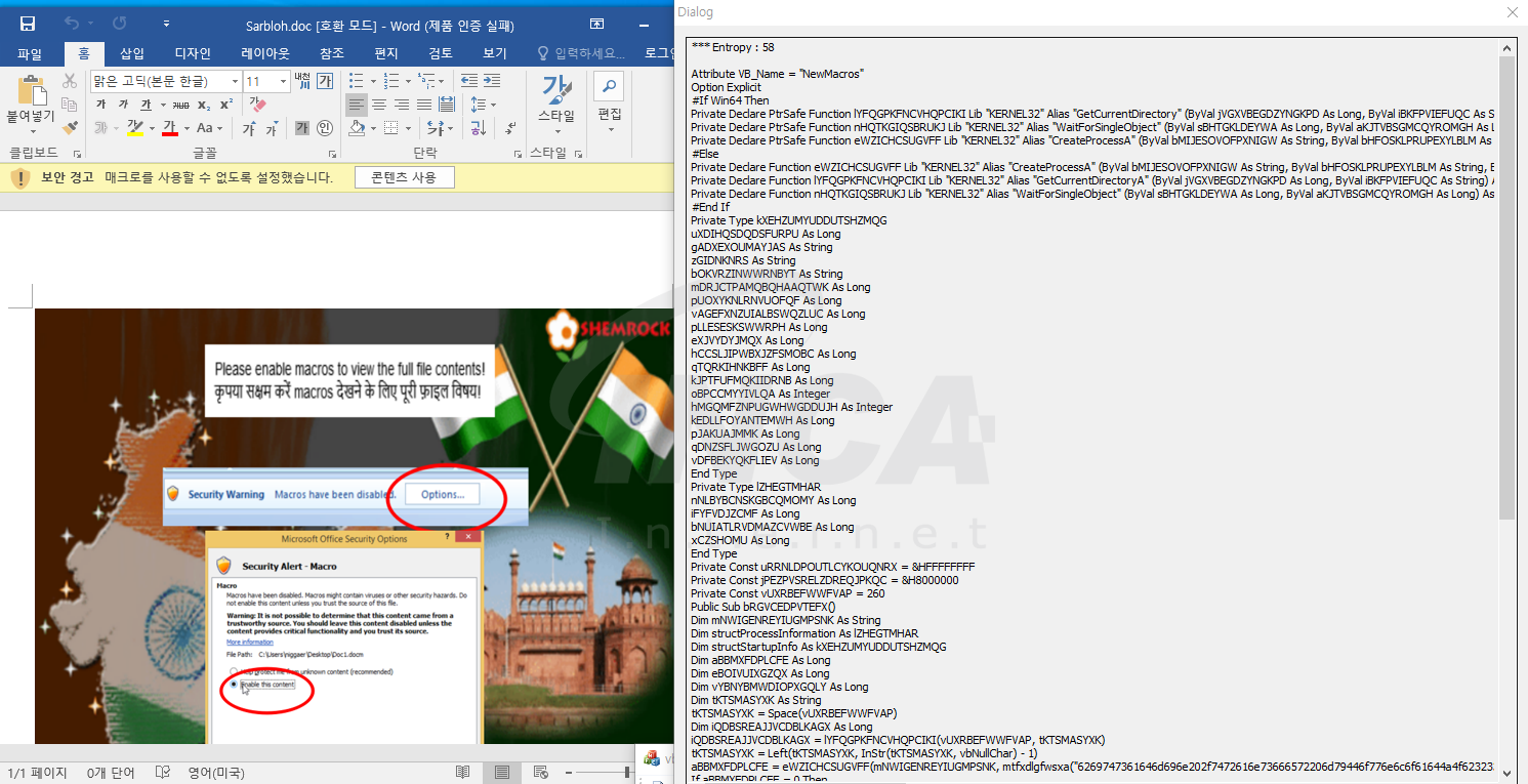 메일에 첨부된 문서 파일 내부에는 난독화 된 VBA 매크로가 존재한다. 해당 매크로는 명령 프롬프트를 이용해 페이로드를 아마존 클라우드 서버에서 다운로드하여 실행한다. 또한, 볼륨 섀도우 복사본을 삭제하여 시스템 복원이 힘들어 진다.
