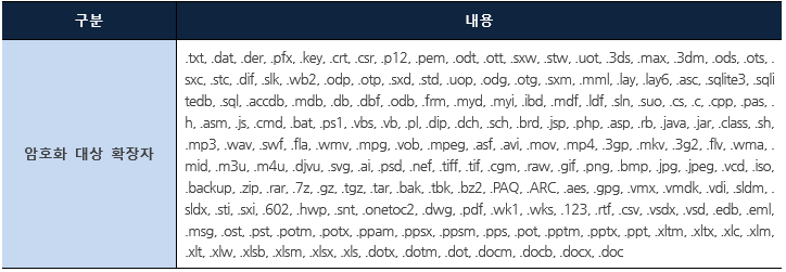 다운로드 된 최종 페이로드인 “Sarbloh” 랜섬웨어가 실행되면 [표 2]에 해당하는 확장자의 파일이 암호화 되며 암호화된 파일명의 확장자 뒤에 “.sarbloh”가 붙는다.
