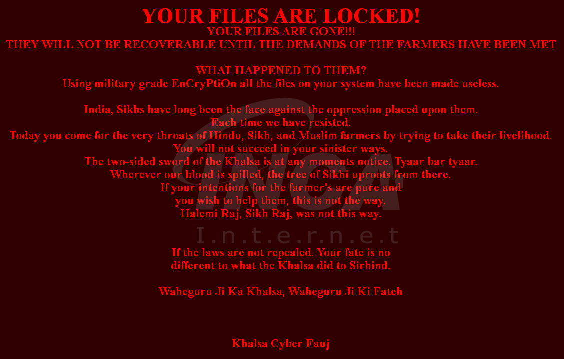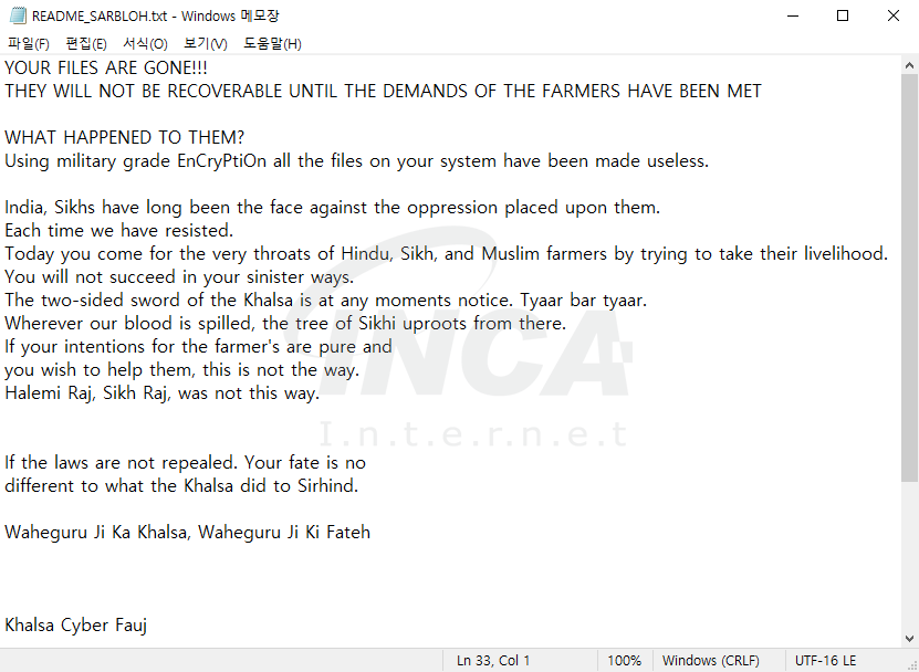 최근 “2020년 인도 농업법”에 반대하는 시위가 일어났으며 법안에 대해 반대하는 세력이 “Sarbloh” 랜섬웨어를 유포하기 시작했다. [그림 1]의 최 하단부에 기재된 힌디어인 “Khalsa Cyber Fauj” 를 해석하면 “칼사의 사이버 부대” 라는 뜻으로, 칼사(Khalsa)란 시크교도들을 가리키는 말이며 이번 법안에 가장 큰 피해를 입은 무리이다. 또한, 랜섬웨어의 이름인 “Sarbloh”는 칼사가 과거에 사용했던 검을 만들 때 사용하는 금속으로 시크교도들의 투쟁 의지를 나타낸다.
