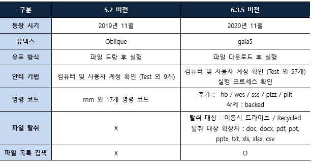 6.3.5 버전에서는 뮤텍스, 유포 방식, 안티 기법 및 명령 코드 추가 등 기존의 기능이 변화되었으며, 파일 탈취 및 파일 목록 검색 등의 기능이 추가되었다.