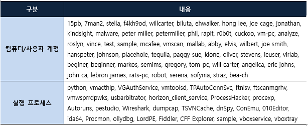 원활한 악성 행위를 위해 분석 환경에서 실행되고 있는지 확인하고, 분석 환경에서 실행되고 있다면 악성코드 실행을 중지한다.