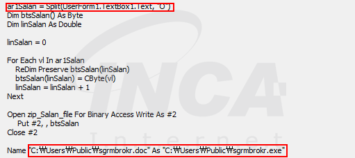 악성 문서의 매크로를 통해 Userform1의 데이터를 알파벳 "O"를 기준으로 디코딩한다. 디코딩한 데이터를 EXE 파일로 저장하여 실행한다.