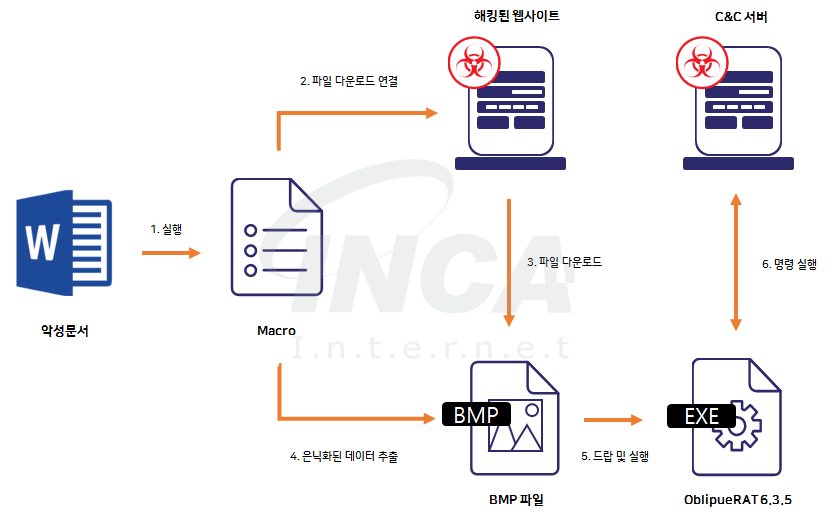 악성문서에서 “ObliqueRAT” 악성코드를 드랍하여 실행하는 방식에서, 파일을 다운로드하여 실행하는 방식으로 유포 방식이 변화되었다.