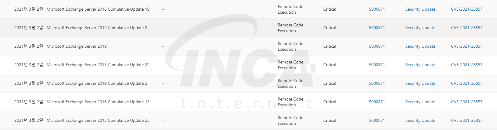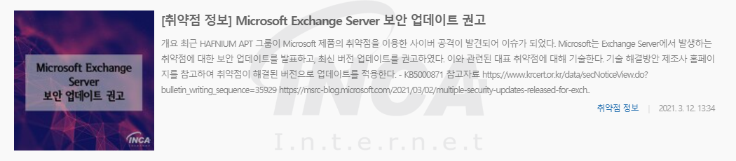 - “[취약점 정보] Microsoft Exchange Server 보안 업데이트 권고” 자사 블로그 게시글 :
