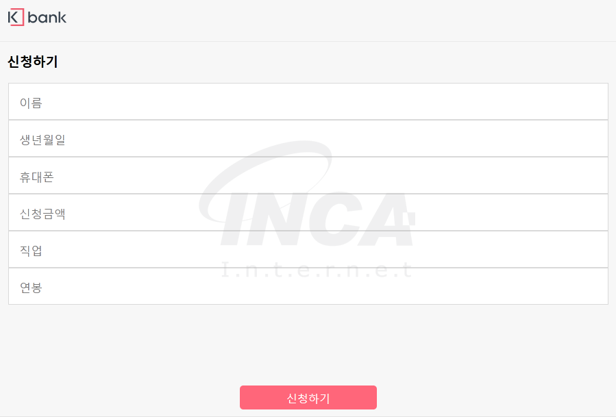 실행 시 가장 먼저 보이는 화면은 [그림 1] 과 같이 케이뱅크를 사칭한 이미지이다. 이미지 하단의 신용 대출 목록을 클릭하면 [그림 3] 과 같은 사용자 정보 입력 화면이 출력된다. 사용자가 정보를 입력하고 “신청하기” 버튼을 클릭하면 입력된 내용이 공격자 서버로 전송한다.