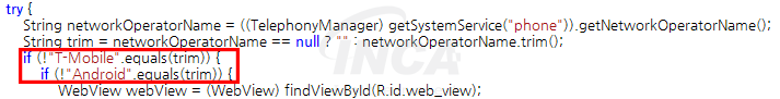 먼저 악성 앱은 현재 실행 환경의 통신 사업자 정보를 읽고 특정 문자열과 비교하여 가상 환경 여부를 확인한다. 가상 환경이면 악성 행위 없이 종료하여 동적 분석을 방해한다.