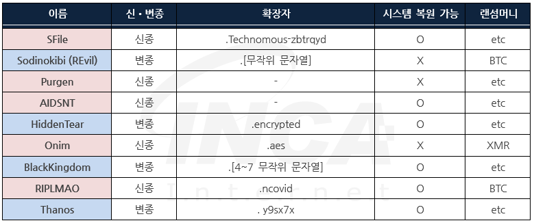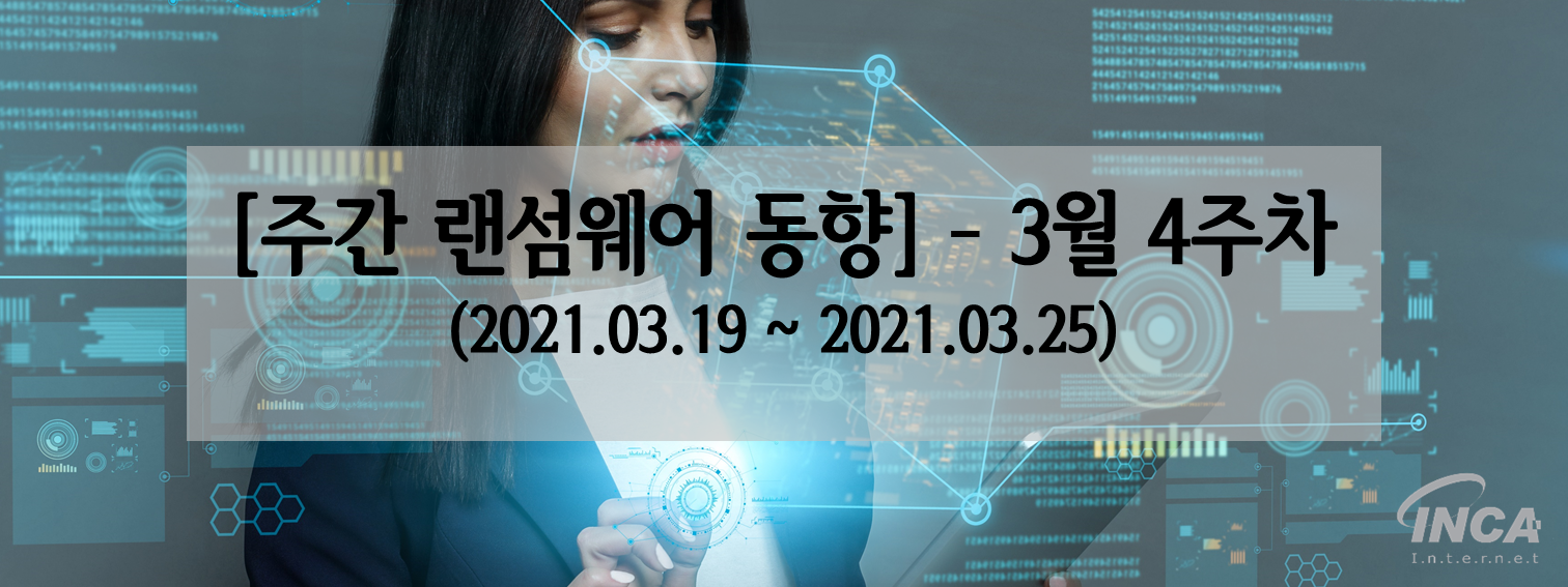 잉카인터넷 대응팀은 2021년 3월 19일부터 2021년 3월 25일까지 랜섬웨어 신•변종 및 이슈와 관련하여 대응을 진행하였으며, 신종 랜섬웨어는 “SFile” 외 4건, 변종 랜섬웨어는 “Sodinokibi (REvil)” 외 3건이 발견됐다.
