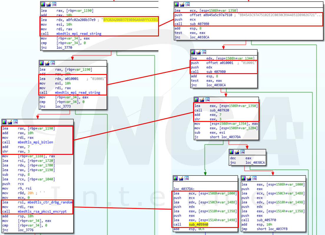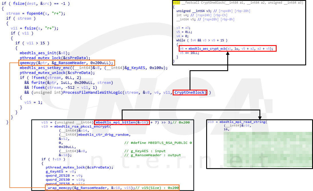 “RansomEXX” 랜섬웨어의 윈도우와 리눅스 버전 모두 파일 암호화를 위해 암•복호화 지원 모듈인 Mbed TLS를 사용한다. [그림 6]은 두 버전이 서로 다른 플랫폼에 제작됐지만 동일한 모듈 사용으로 인해 코드 유사성이 높다는 점을 보여준다.