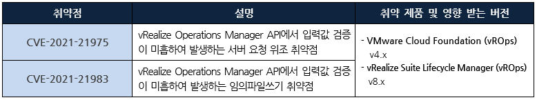 VMware 사는 제품에서 발생하는 취약점에 대한 보안 업데이트를 발표하고, 관련 취약점을 해결하기 위해 최신 버전으로 업데이트할 것을 권고하였다.
