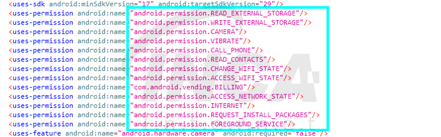 해당 앱은 아래의 이미지와 같이, 악성 동작에 필요한 여러 권한을 취한다.