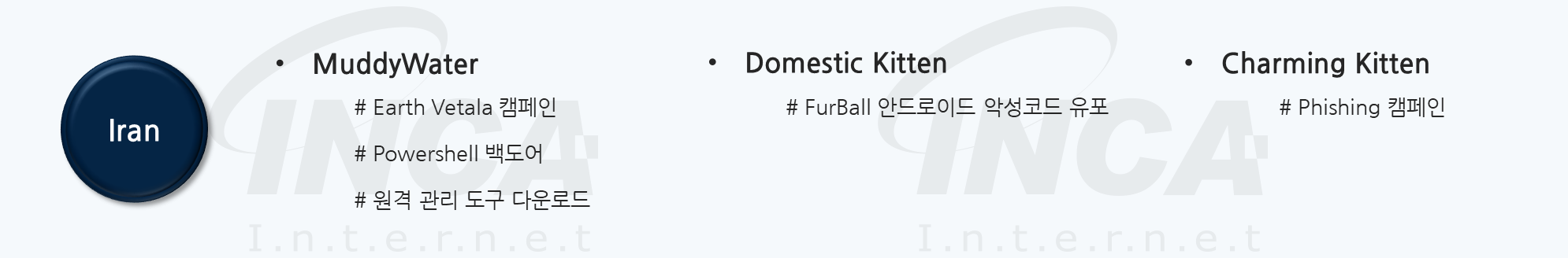 Domestic Kitten 해커 그룹은 2016년 최초 발견되었으며, 내부의 반체제 인사, 야당 세력 등 이란 정권의 안정을 위협할 수 있는 상대를 대상으로 지속적인 대규모 감시 작전을 수행한 것으로 알려져 있다.