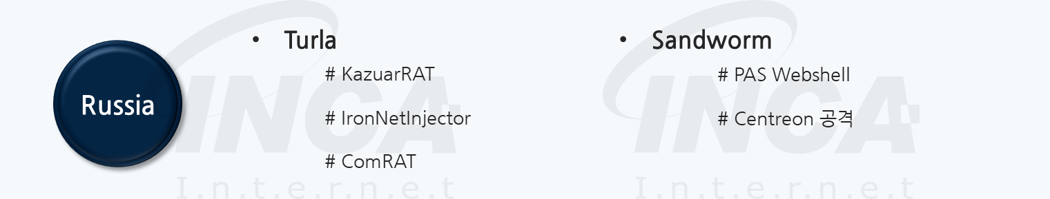 이번 1분기에는 러시아 정부의 지원을 받는 것으로 알려진 해커그룹 중, Turla 해커 그룹과 Sandworm 해커 그룹의 공격이 활발했던 것으로 나타났다. Turla 해커그룹은 1월에 지난 SolarWinds 사태의 배후로 지목되었으며 3월에는 닷넷 프레임 워크를 대상으로 하는 오픈소스 Python을 이용한 변종 악성코드를 선보였다. 2월에는 Sandworm 그룹이 3년간 프랑스 소프트웨어 기업을 공격한 배후로 지목되었다.