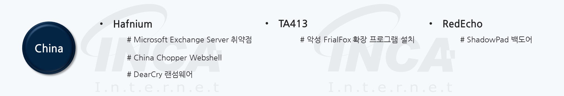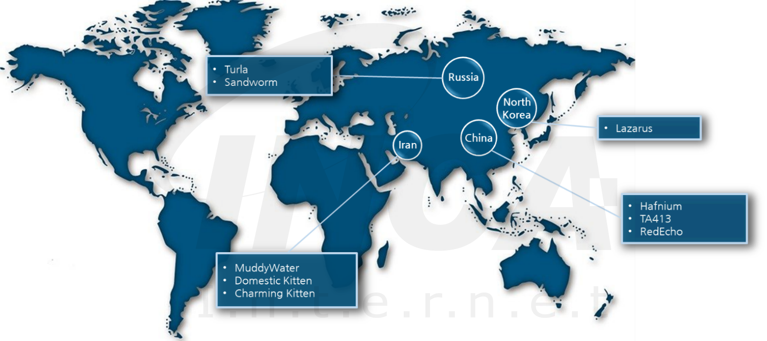 중국 정부의 후원을 받는 것으로 알려진 해커 그룹들은 특정 국가 혹은 기업의 정보를 탈취하기 위해 주로 제품의 취약점을 이용하거나 피싱 이메일을 통해 악성 행위를 수행하고 있다.