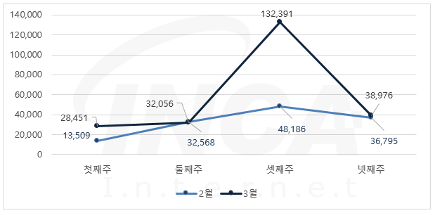 3월 한달 동안 악성코드 진단 현황을 주 단위로 살펴보았을 때 2월에 비해 증가한 추이를 보이고 있다.