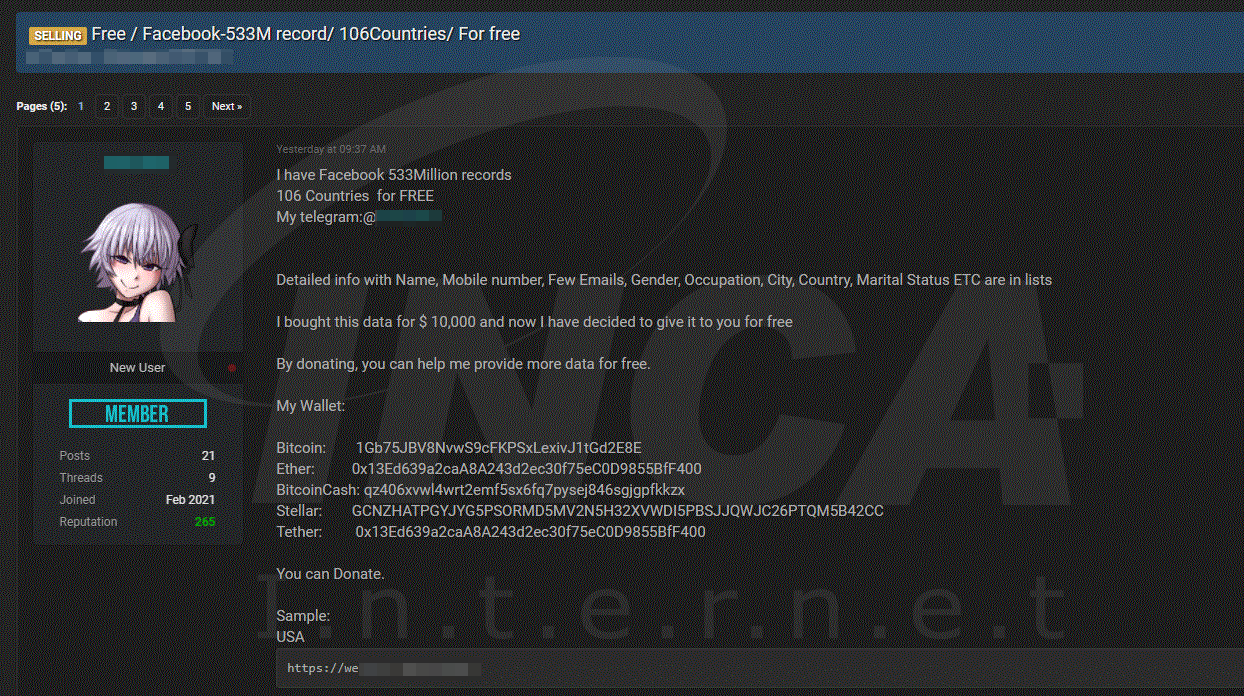 이를 유출한 해커는 2019년 Facebook 취약점을 통해 탈취된 데이터이며, $10,000 가격에 데이터를 구매하여 공개한다고 밝혔다. 해커는 미국 사용자의 데이터를 무료로 공개하였으며, 이외에 데이터는 해커 포럼의 화폐인 8 Credit을 통해 판매하고 있다.