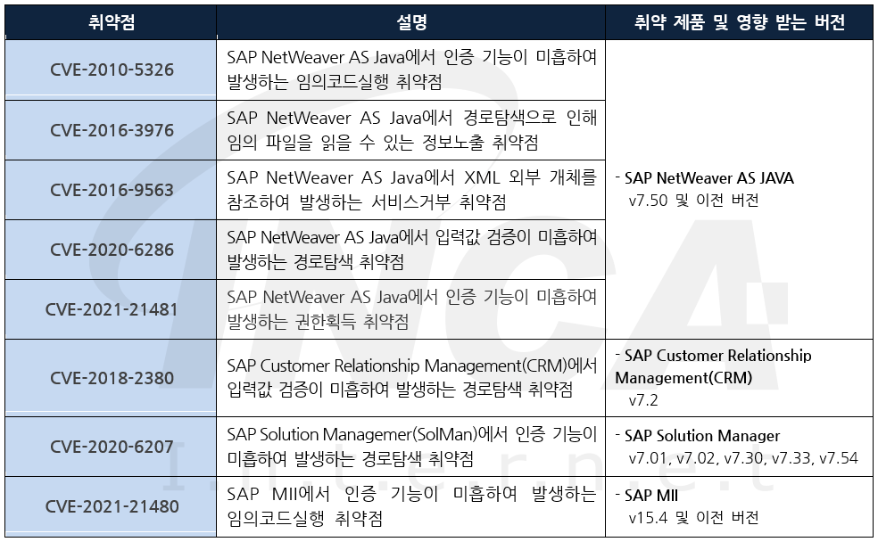 SAP 소프트웨어 사는 제품에서 발생하는 취약점에 대한 보안 업데이트를 발표하고, 관련 취약점을 해결하기 위해 최신 버전으로 업데이트할 것을 권고하였다.